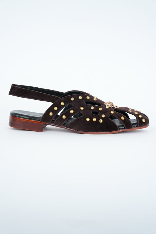 CLASSIC BROWN STRIPE WITH GOLD PINS AND LION STUD CUT SANDALS