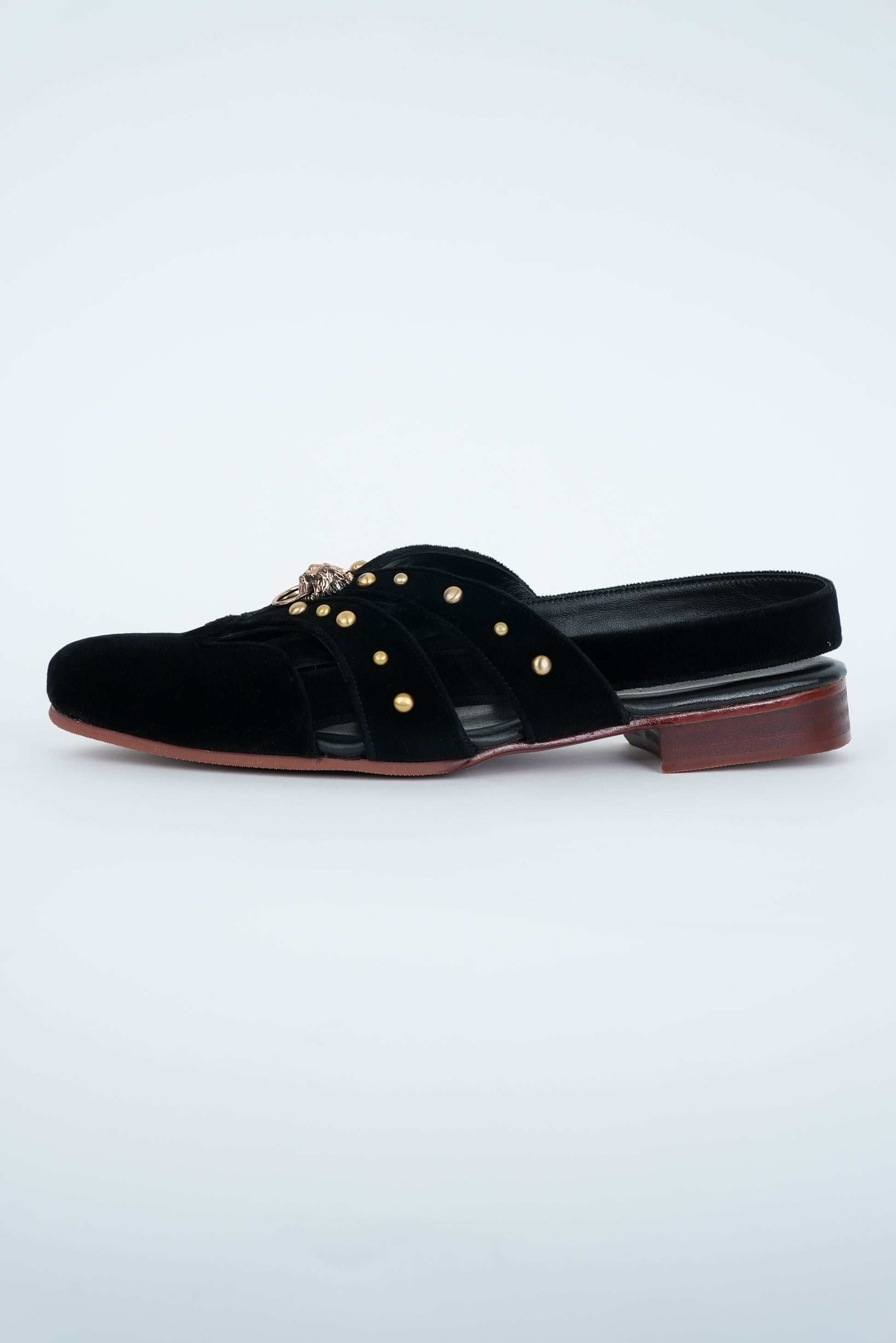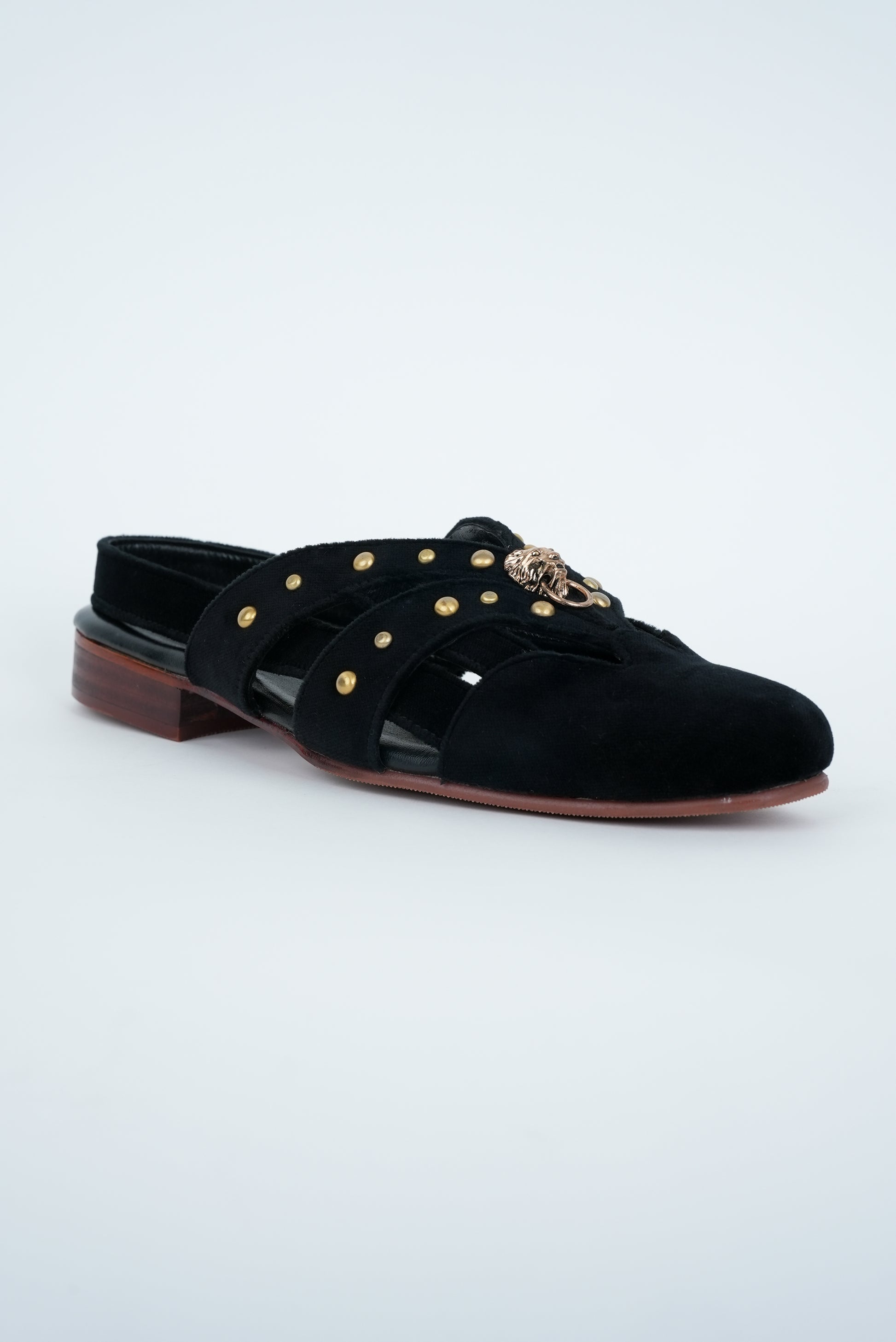 CLASSIC BLACK WITH GOLD PINS AND LION STUD CUT SANDALS