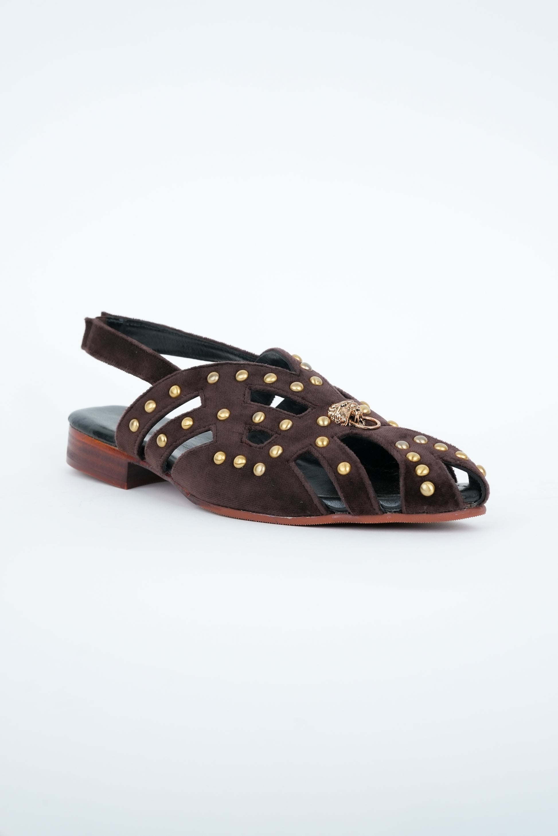 CLASSIC BROWN STRIPE WITH GOLD PINS AND LION STUD CUT SANDALS