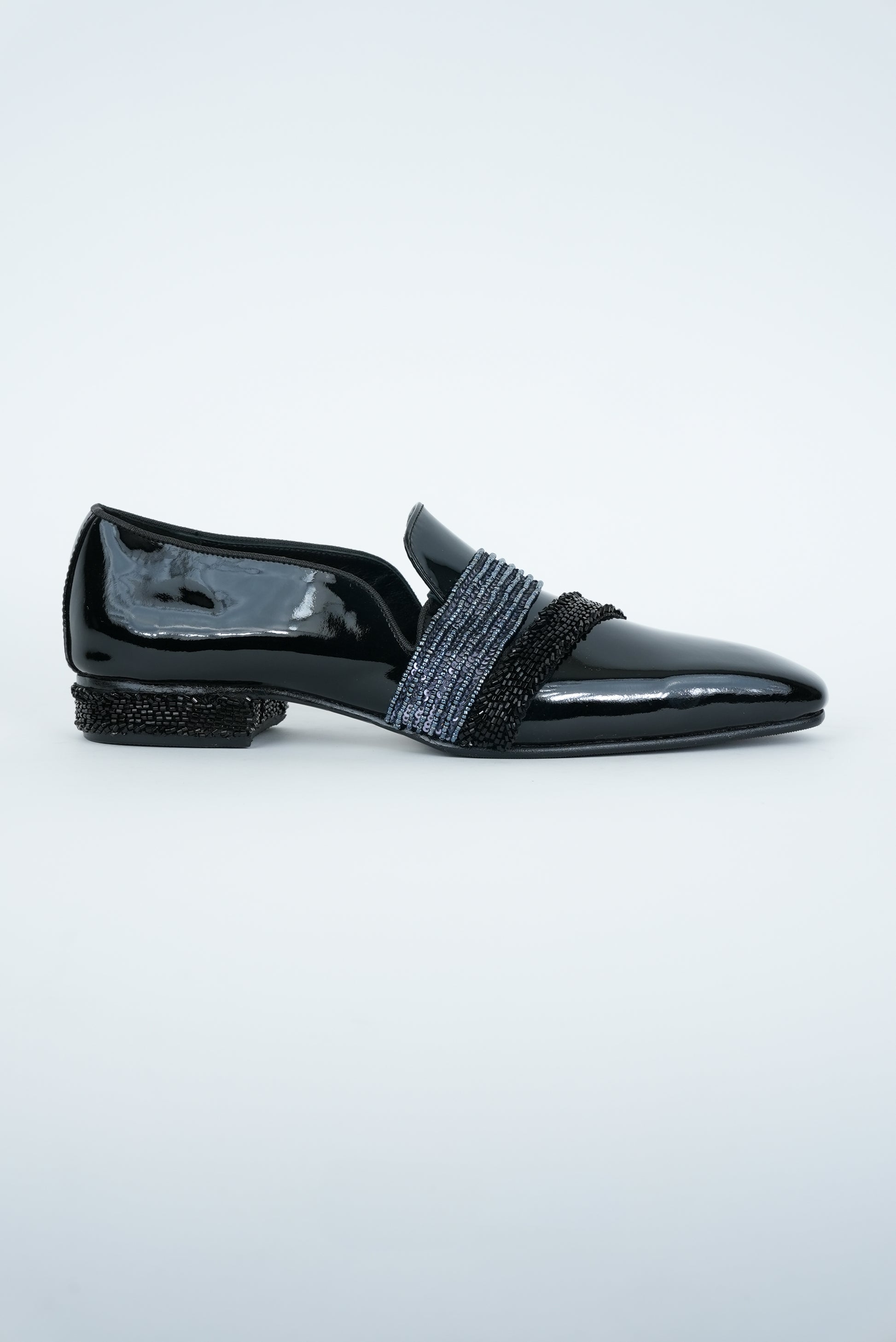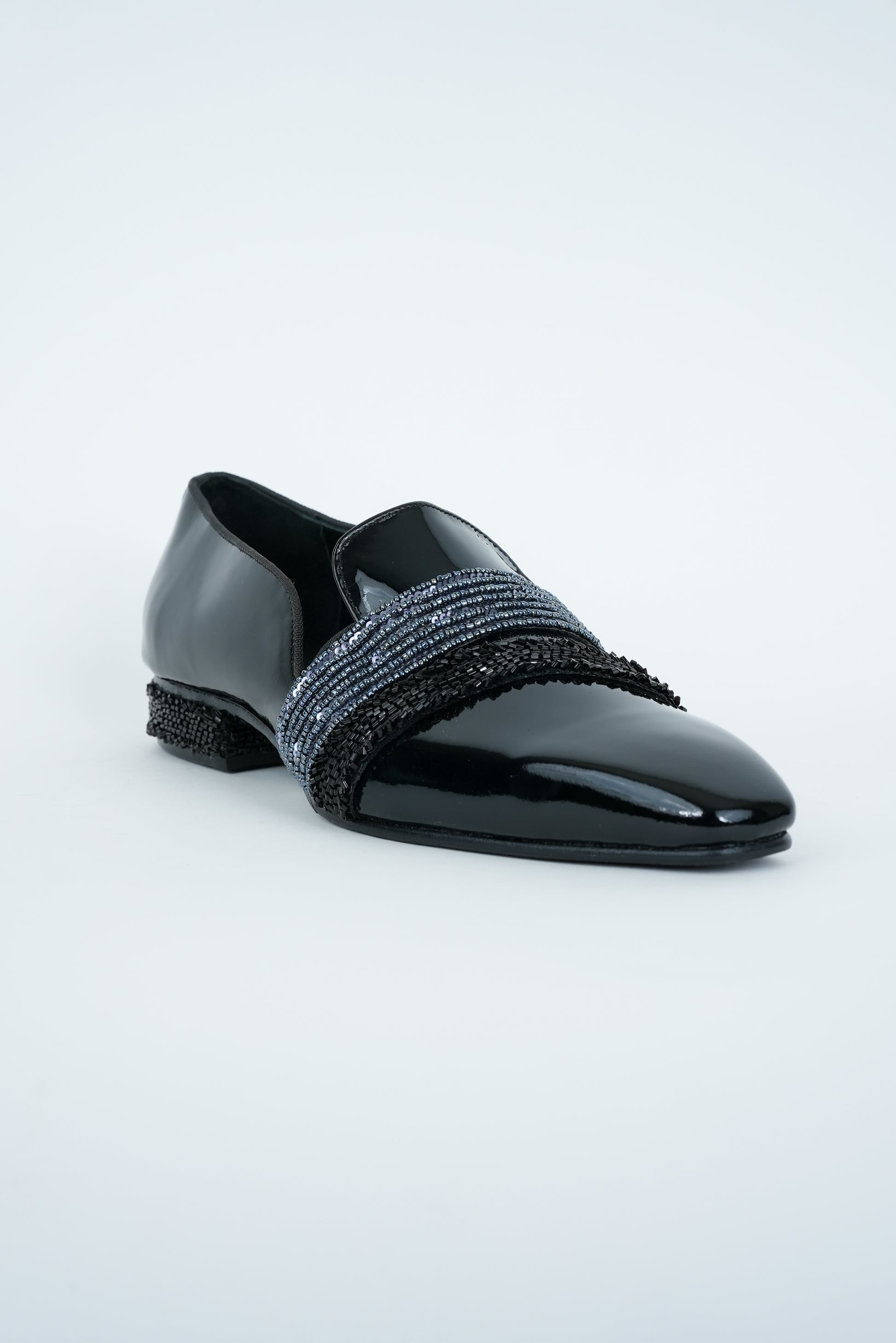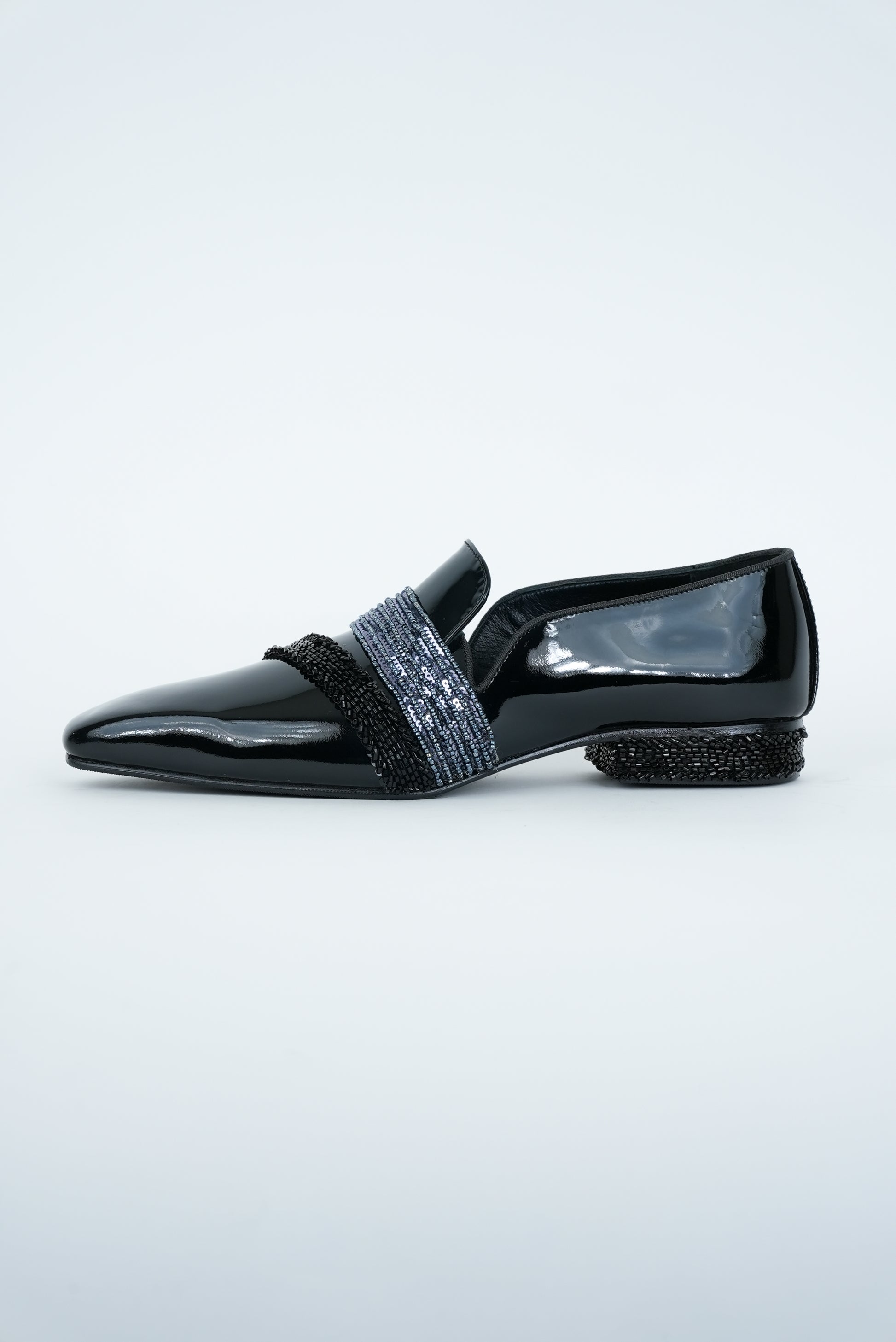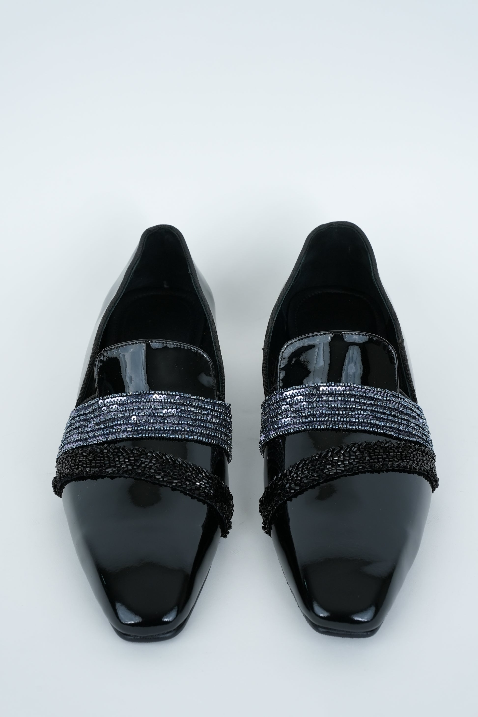 GLOSSY NAVY SQUARE POINTED TOE LOAFER TUXEDOS WITH METALLIC BLACK EMBRIODERY STRIPES